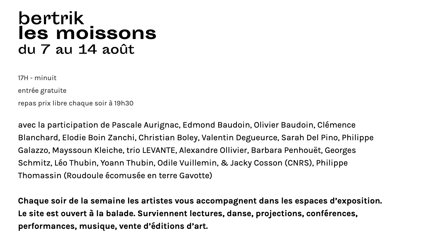 Surviennent lectures, danse, projections, conférences, performances, musique, vente d’éditions d’art.